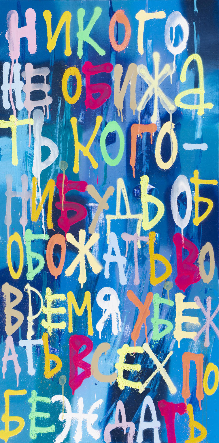 Kirill Lebedev has always practiced street art and later began to also create graphics and paintings. He defines his art as “post-graffiti”, similar to graffiti culture, Vienna actionism, and poetry. His recognizable style is witty sayings in rainbow-coloured handwritten fonts. His works are presented in the collection of the MMOMA.