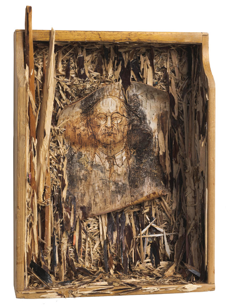 wood, burning, coffee, sawdust, fabric, synthetic hair, watercolor, color, water dispersion paint, mixed media144 х 128 cm