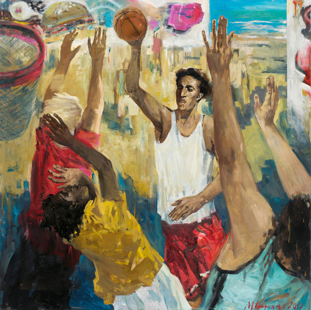 «Работа “Уличный баскетбол” входит в серию “Пространства и наполнения”. Основная идея этих работ — движение и скорость в современной жизни. Здесь все неоднозначно, молодость дает нам возможность развиваться, видеть и многое делать, быть свободными в своем выборе. Но с другой стороны, человек в современном мире гаджетов и постоянного технического прогресса порой теряет способность наслаждаться простыми вещами и перестает замечать, как дети строят замки на берегу, как отдыхающие люди играют в баскетбол во дворе, как подул легкий южный ветер во время прогулки, а шум прибоя прибил к берегу улетевшую шляпу. Образы из проекта — это современные герои, затерянные где-то в южных городах, где так легко почувствовать вдохновение от старинных улочек и набережных, кафе, открытых террас, пляжей и бассейнов. Мне хочется удержать ускользающие образы лета, запечатлеть сиюминутное происходящее ощущением нахождения "здесь и сейчас", ощущение пустоты и наполненности».