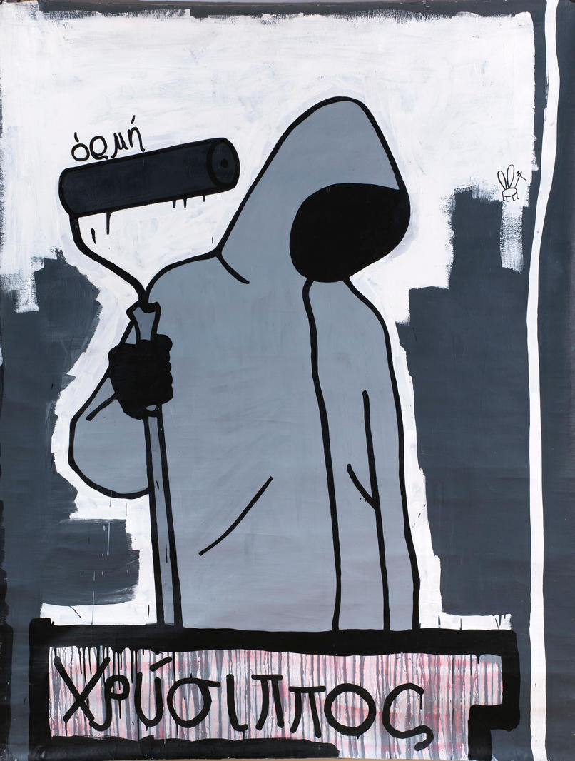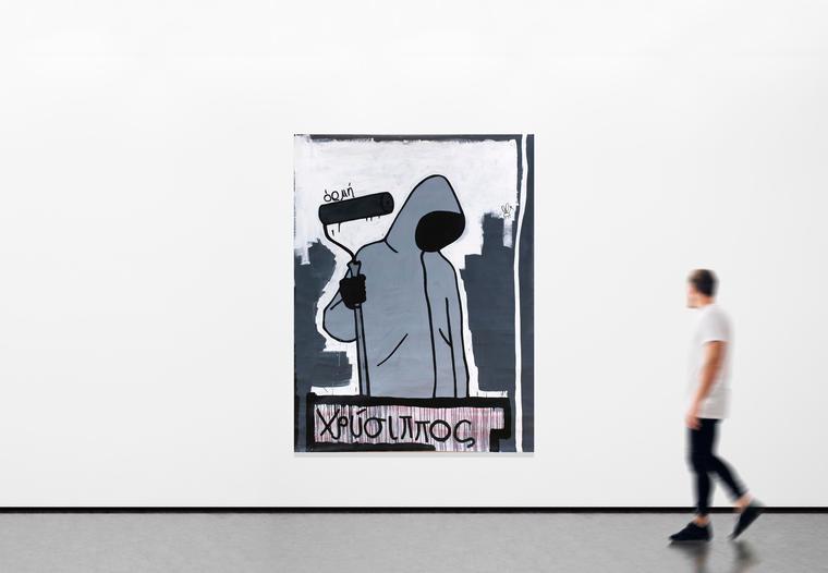 Работа «ХРСИПП» — синтез характерных для творчества Валерия Чтака черт, среди которых лаконичность, строгость композиционных решений, монохромная цветовая гамма, а также соединение изображения и слова. Главный герой полотна — человек в сером худи, капюшон которого скрывает лицо, обеспечивая анонимность, столь необходимую для стрит-арт художника. Над валиком в руках изображенного персонажа написано слово οσμη, которое переводится с древнегреческого как «запах». Вдоль нижней кромки холста художник размещает имя афинского стоика Хрисиппа (χρυσίππους), жившего в III веке до нашей эры и, согласно одной из версий позднеантичного историка философии Диогена Лаэртского, умерший от припадка смеха.