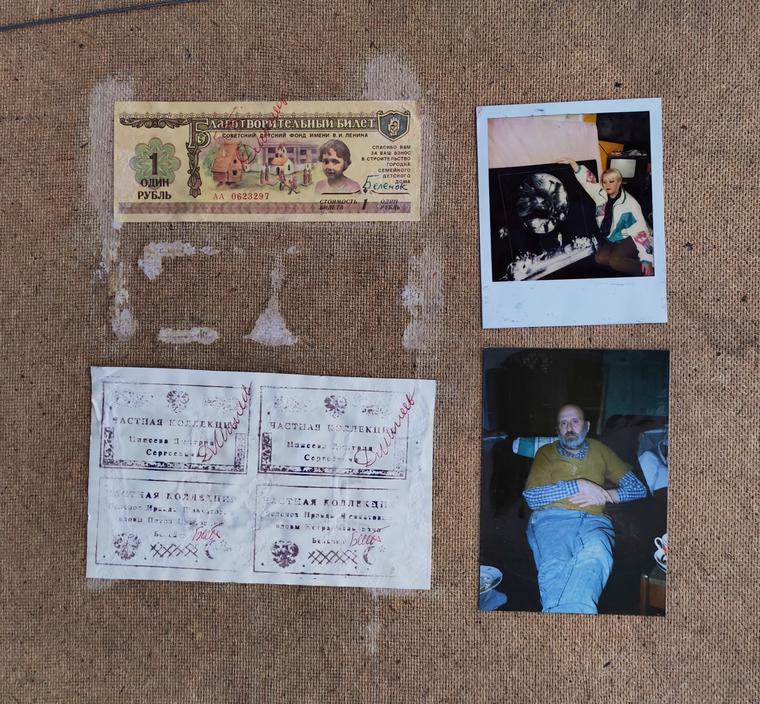 На оборотную сторону работы вклеен благотворительный билет, средства с продаж которого шли в помощь детям-сиротам. Художник часто покупал билеты на деньги, которые приносили редкие продажи произведений, и дарил жене — для нее, как для воспитанницы детского дома, такие вещи имели особое значение. На оборотах работ билеты размещались Беленком «на удачу», представляя собой своеобразное воплощение перформативной практики художника.