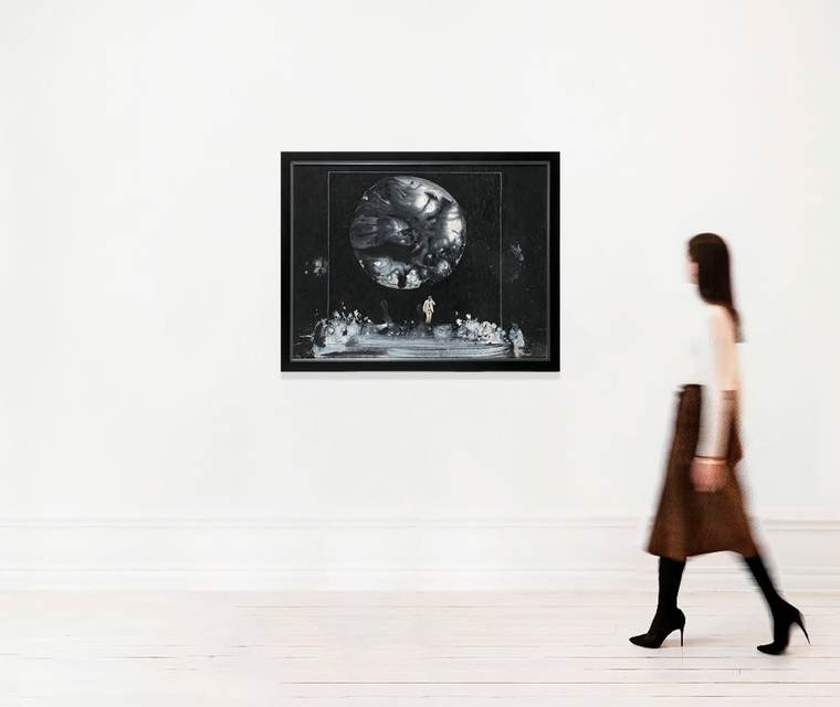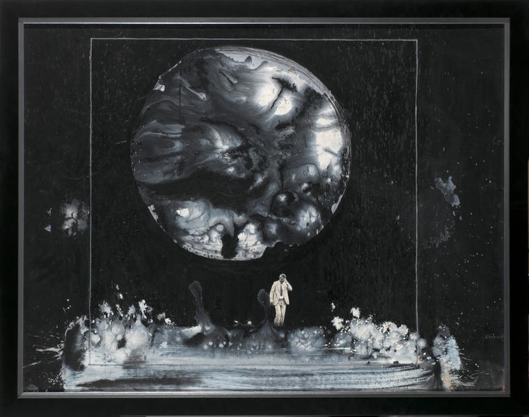 Ровный, геометрически идеальный диск луны становится композиционным центром полотна, выполненного в монохромной цветовой гамме. Играя с оптикой восприятия, Беленок помещает мужского персонажа рядом с массивным силуэтом спутника Земли, на его фоне герой становится практически незаметным. Он не обращается в бегство, спасаясь от катастрофы межпланетного масштаба, — столь характерного сюжета для произведений Беленка. Герой картины, наоборот, словно застывает во времени и пространстве, любуясь небесным телом.