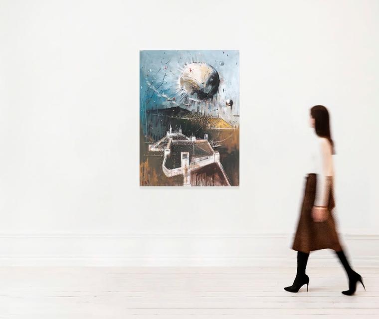 Представленная работа из серии «Картография» — это визуальное размышление об условности границ правдивого. С одной стороны, карта — документ, отражающий реальное положение вещей, с другой — творческая интерпретация увиденного путешественником. Художник вспоминает, что впервые нарисовал этот образ еще в одиннадцать лет. Тогда это была детская игра в моделирование пространства. Сегодня же карта для Батынкова представляет собой идею богатую на пластические и эстетические интерпретации. В работе 2012 года художник создает схематическое изображение загородной резиденции — шато, с высоты птичьего полета. Батынков использует чертежную манеру письма, строгие и четкие линии контура для фиксации архитектурной формы. Однако, фоновое пространство решено совершенно в ином духе: густые потеки краски, тут и там подобно рою пчел кружат самолеты, сферы, парящие над размытым ландшафтом, будто открывают порталы в иные миры. Живопись Батынкова — это зафиксированное движение изображенных объектов. Каждый из элементов на полотне будто вот-вот сорвется с места, перестанет быть неподвижным.
