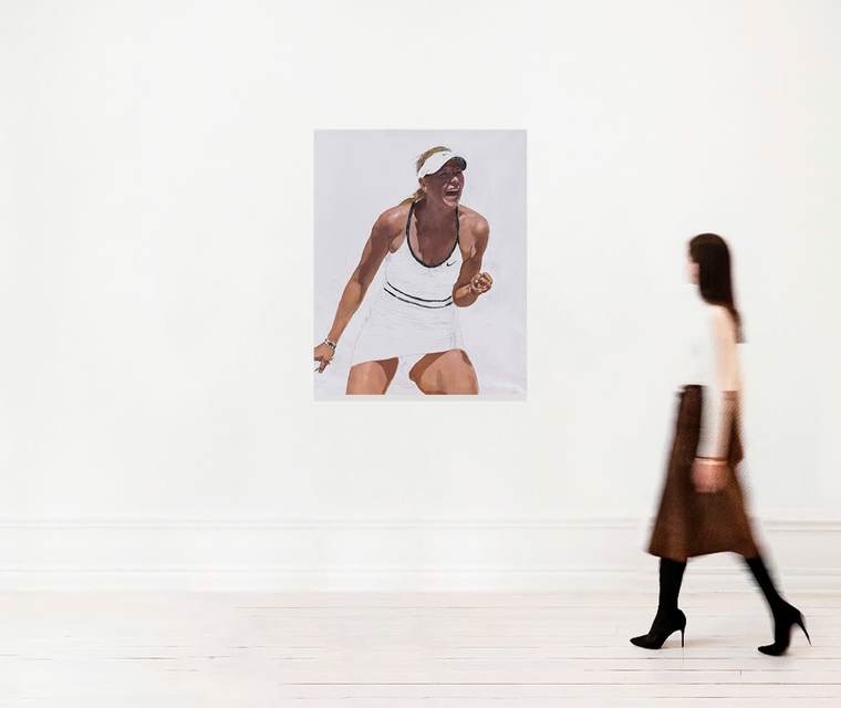 В представленной работе Михаила Блинова узнаваемое «глянцевое» изображение теннисистки Марии Шараповой переносится с обложек журналов на поверхность холста. Художник обращается к теме преодоления человеком границ своих физических возможностей. Выполненный в реалистичной манере женский образ буквально застывает в пространстве, практически сливаясь с белым фоном. При этом, изображая теннисистку, Блинов мастерски передает физическое напряжение — тело героини замирает в моменте наибольшего мышечного усилия.