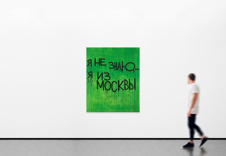 Представленная на торгах работа относится к новой версии знаменитой серии Валерия Чтака «Я не знаю, я из Москвы». Изначально в 2019 году она создавалась исключительно белым чтаковским шрифтом по темно-серому фону. «Я не знаю, я из Москвы» — простая фраза, вызывающая множество мыслей и ассоциаций у всех граждан России. Когда Чтак сам рефлекторно, естественно произнес эту фразу пару раз, находясь в Санкт-Петербурге, он понял, что в общем-то она имеет иконическое значение. Вырисовывается собирательный образ «москвича», но оттенки восприятия могут быть разными, и зависят они от того, куда эту фразу поместить. Если в самой столице, то представляется вечно спешащий и занятой человек, которому всегда не до вас, он очень устал или опаздывает. Или же живет за границей большую часть времени, здесь сдает квартиру, бывает редко. Так и получается, все «москвичи», но никто не знает «Как пройти?».