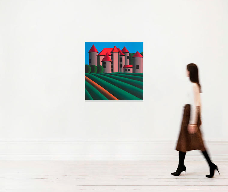 Позднее в произведениях художника появляется авторский мотив средневекового замка — игрушечного, собранного по частям и буквально застывшего во времени. В представленной работе 2023 года Хвостов изображает одну из таких построек на фоне летнего пейзажа. Замок, словно созданный из деталей конструктора, становится композиционным центром картины и вступает в контраст с насыщенным зеленым цветом поля. Создается впечатление, что изображенные на картине объекты выполнены из синтетического материала, а сконструированное из них безвоздушное пространство вовсе неподвижно. Ритмичные линии, рассекающие поле, создают эффект равномерной пульсации, которая также подчеркивает «механистичность» техники исполнения. Упрощенные геометрические формы, расцвеченные яркими цветами, которые выстроены по градиентной растяжке, сообщают живописи декоративный эффект такой интенсивности, что полотно тяготеет к эстетике графического дизайна. Хвостов создает пейзаж, в котором гладкие яркие формы в ровном холодном освещении представляют собой нечто искусственное, а сформированные из них безвоздушные пространства существуют вне времени в качестве неких условных моделей мира.