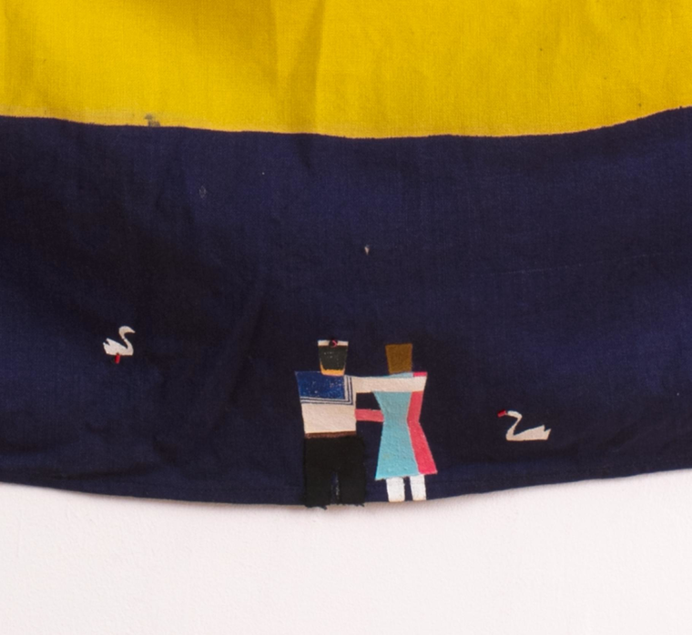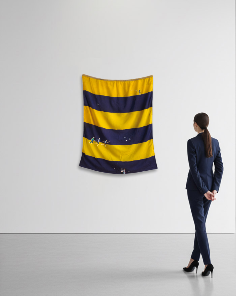 Андрей Крисанов вырос в морском городе Новороссийске и всегда мечтал быть моряком, именно поэтому в его работах можно столь часто увидеть фигуры кораблей и изображения матросов. По словам художника, если бы не знакомство с Сергеем Бугаевым (Африка), то он не переехал бы в Ленинград и не стал заниматься искусством. Представленная на торгах работа «Каникулы», выполненная на старом сигнальном морском флаге, отсылает к этой юношеской мечте. Поверх ровных цветных полос художник помещает изображения персонажей и мелкие предметы, которые хаотично располагаются по всему пространству тканевой материи. Облик героев, чьи тела созданы из геометрических фигур, отсылает к «квадратноголовому стилю», одним из основателей которого являлся Крисанов. Впоследствие тенденция на изображение подобных персонажей была подхвачена многими «Новыми художниками» и включала в себя экспрессивные пиктографические сюжеты с нарочито упрощенной лирикой. Вместе с тем, лаконичным композиционным решениям Андрей Крисанов определенно научился у Тимура Новикова, чьи тряпичные панно конца 1980-х годов были построены с учетом разработанной им теории о «знаковой перспективе»: когда несколько небольших элементов уравновешивают большое пространство.