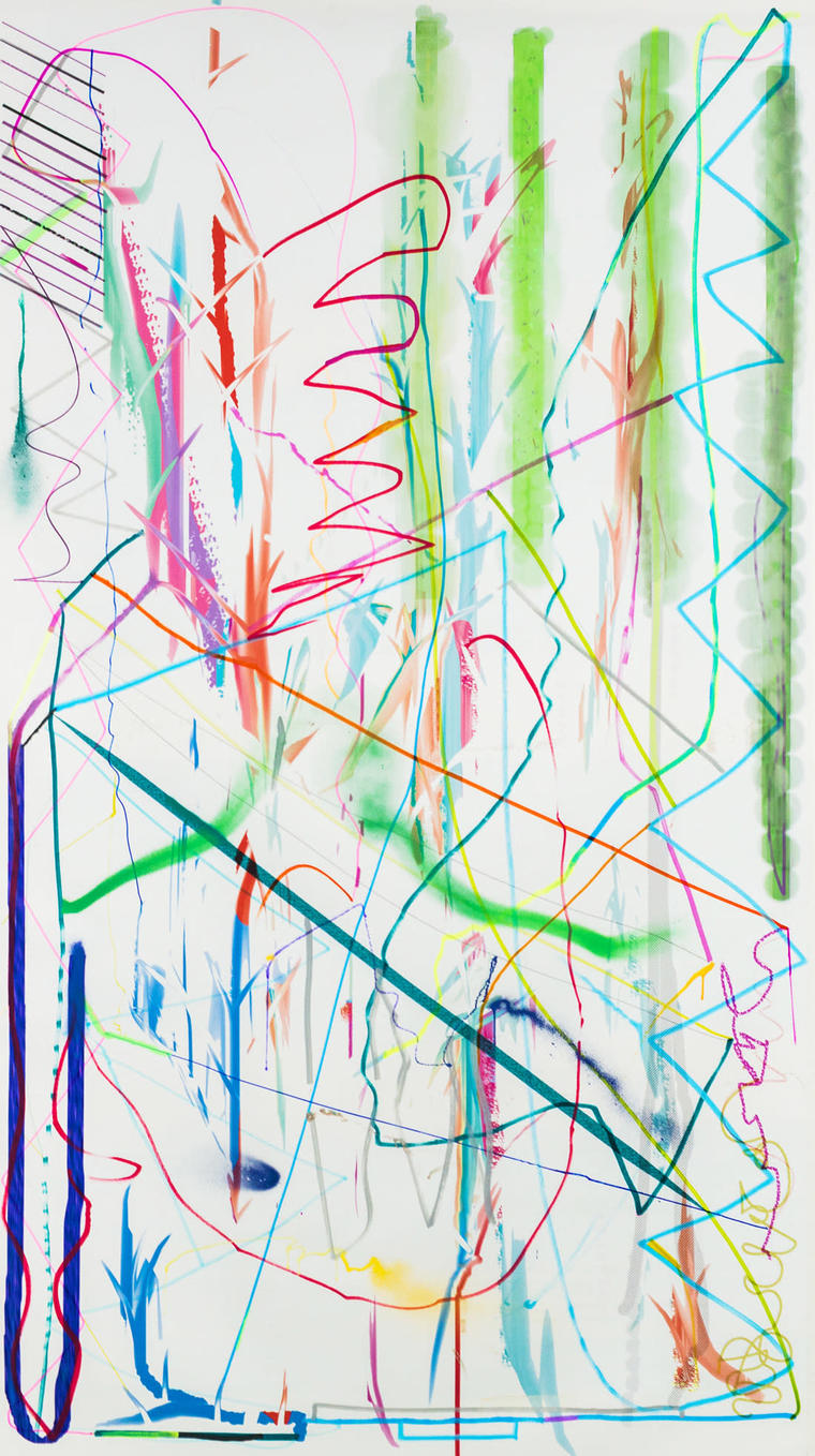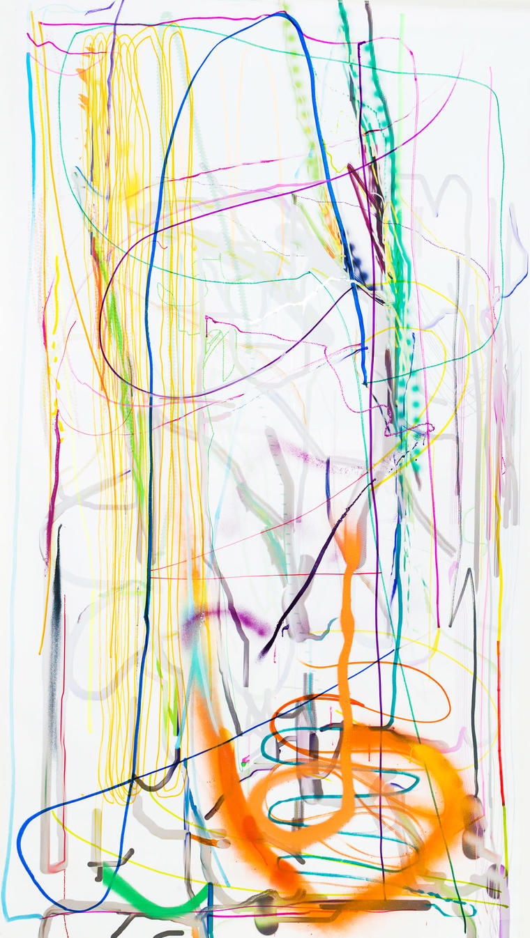 «”4d/4p(+p)” — серия, в которой я впервые стал применять свою авторскую технику многократного чередования живописи и печати. Суть техники заключается в том, что печать происходит поверх уже нанесенного рисунка или живописи. Следом наступает очередь “ручного” взаимодействия с холстом, для которого я использую различные материалы — краску в тюбиках, аэрозольные баллончики, маркеры. Такие чередования происходят многократно (не менее 4 раз, как я установил в этой серии) и позволяют создать новые отношения на холсте, где нарисованные и напечатанные линии наслаиваются и продолжаются, «выходя» одна из другой.