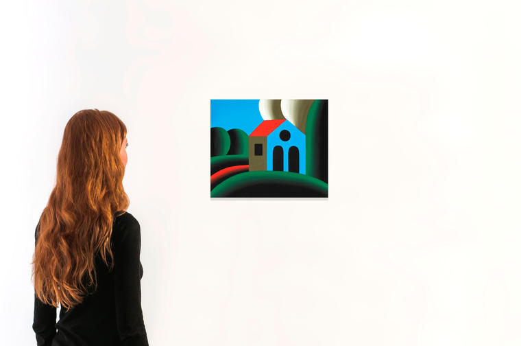 В представленной на торгах работе художник изображает дом на фоне лесного пейзажа. Создается впечатление, что деревья и здание выполнены из синтетического материала и отдаленно напоминают пластиковую декорацию. Ритмичные линии, изображающие возвышающиеся холмы, создают эффект равномерной пульсации. Упрощенные геометрические формы, расцвеченные яркими цветами выстроены по градиентной растяжке. Это подчеркивается «механистичностью» техники исполнения, которая отсылает к эстетике графического дизайна.