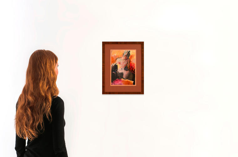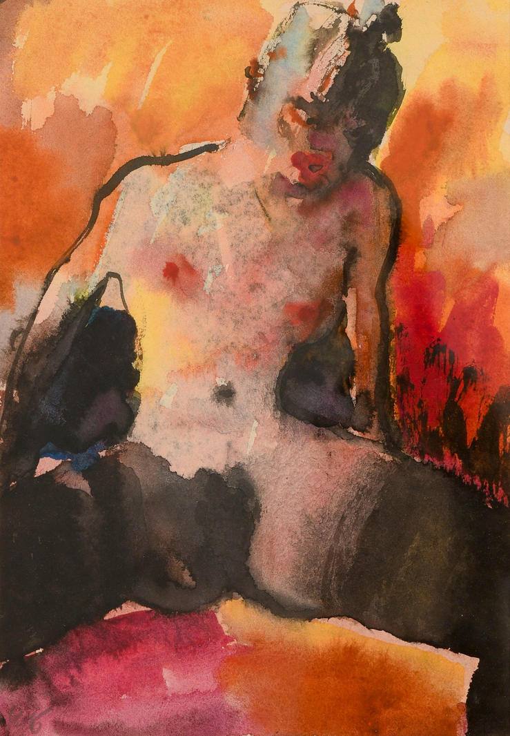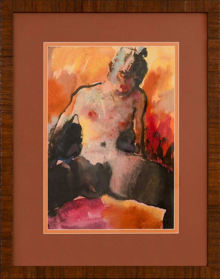 Представленная на торгах акварель — редкое обращение Константина Батынкова, предпочитающего работать в жанре пейзажа, к обнаженной натуре. Фигура главной героини занимает большую часть поверхности листа, тонкие черные линии, будто проведенные в несколько виртуозных движений, отделяют женский силуэт от абстрактного фона. Художник использует контрастную цветовую гамму, построенную на сочетании оранжевых, красных и черных оттенков, которые многократно усиливают эротизм и некоторую провокативность образа.