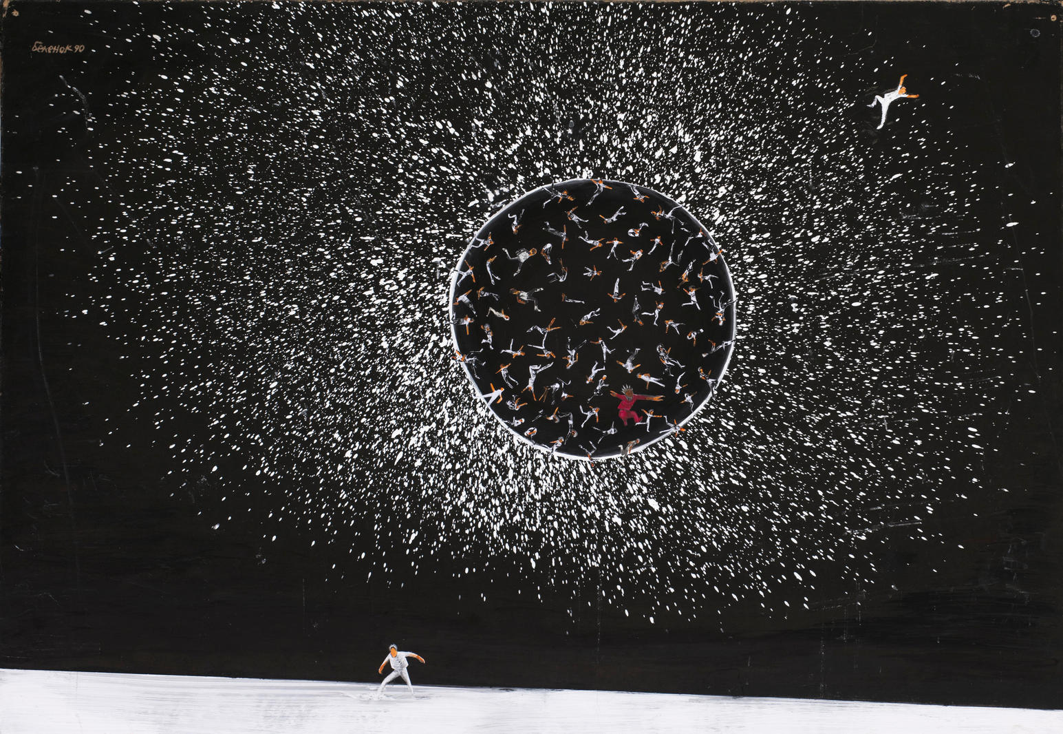 В разное время современники художника трактовали работы по-разному: в 1960–1970-х видели связь с научной фантастикой и популярной тогда темой освоения космоса, ближе к 1980-м чаще отмечали в них соответствие напряженным настроениям тех лет, а затем и тревожное предчувствие чернобыльской катастрофы и распада СССР. Но эпохи уходят, а произведения искусства остаются, и сегодня мы видим в этих работах что-то иное, актуальное или вневременное. В работах Петра Беленка сюжет всегда остается открытым, загадочным. Художник помещает героев в бескрайние пространства, в которых поэтически и фантастически происходят абстрактные катастрофы. Доминирующий белый цвет подчеркивает ирреальность происходящего — это звенящее пустое пространство, вспышки или пыль от взрывов, следы стремительных падений.