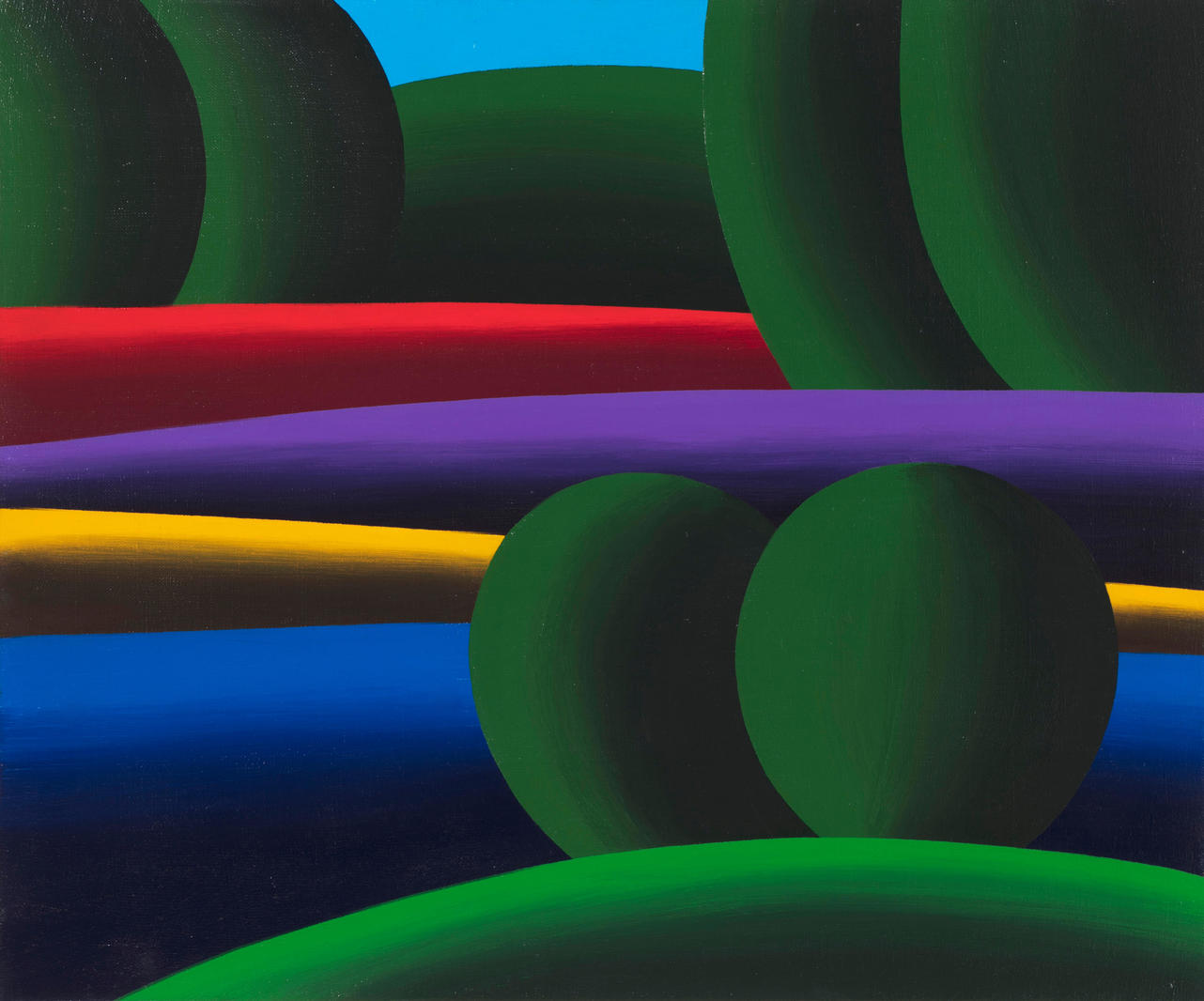 Объекты на представленной работе словно выполнены из синтетического материала, а сконструированное из них безвоздушное пространство вовсе неподвижно. Ритмичные линии создают эффект равномерной пульсации, которая также подчеркивает «механистичность» техники исполнения. Упрощенные геометрические формы, расцвеченные яркими цветами, которые выстроены по градиентной растяжке, сообщают живописи декоративный эффект такой интенсивности, что полотно тяготеет к эстетике графического дизайна. Хвостов создает пейзаж, в котором гладкие яркие формы в ровном холодном освещении представляют собой нечто искусственное, а сформированные из них безвоздушные пространства существуют вне времени в качестве неких условных моделей мира.