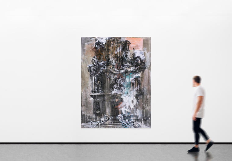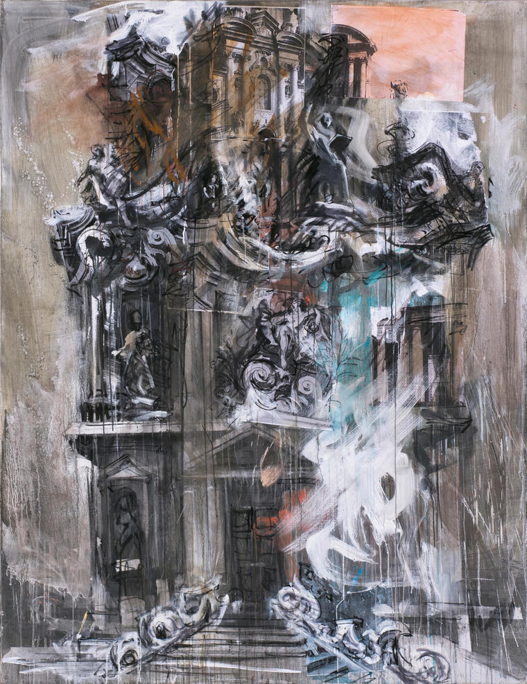 Масштабная композиция «Барочный портал церкви» является блестящим примером свободных живописных фантазий художника на темы больших стилей прошлого. Здесь можно усмотреть и работу с жанром городского пейзажа, и аллюзии на архитектурное каприччо и археологическую ведуту. В противоположность типичным произведениям Кошлякова эта вещь, однако, удивляет внезапными вкраплениями розового цвета, отличающимися от его «классической» монохромии. За счет такого цветового решения художник расставляет акценты и словно показывает, как из глубин городского пейзажа прорывается нечто иное, возможно, то самое идеальное утопическое пространство.