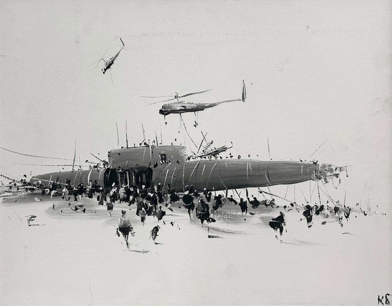 Работа создана в характерной для произведений Константина Батынкова 2000-х годов монохромной цветовой гамме. От изобилия мелких штрихов, деталей создается впечатление стремительно летящей фантазии художника. Благодаря беглому и свободному мазку, формирующему композицию, и нечеткости контуров и форм, его полотна замирают на тонкой грани между абстрактной и фигуративной живописью.