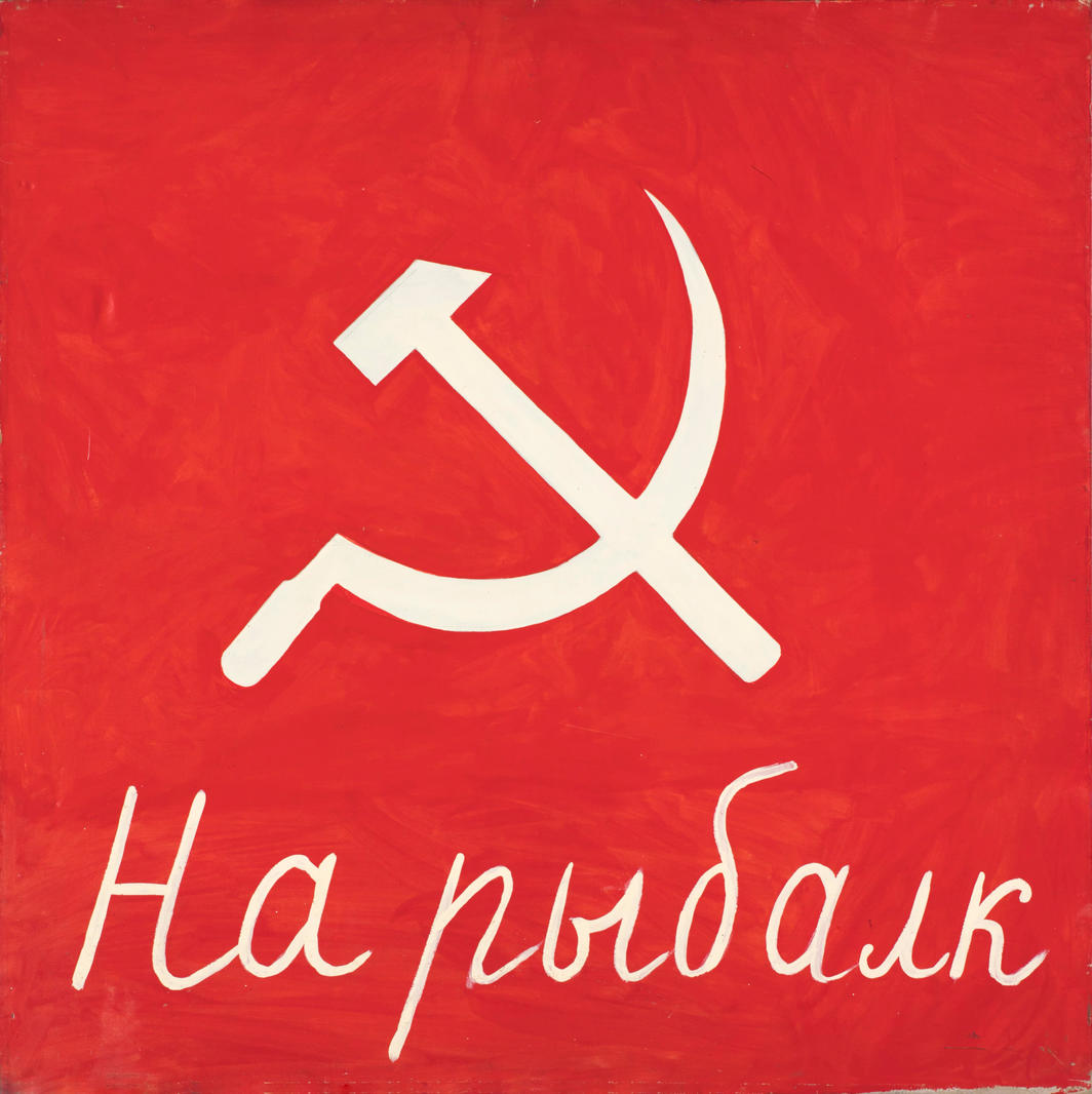 На красном фоне художник размещает серп и молот — один из главных советских символов и дополняет абсурдной надписью «На рыбалк», в которой комозиционно мешала буква «е». Работа переходного периода — одно государство уже почти распалось, а новое еще не создано. По этой работе видно, насколько «Чемпионам» была важна трикстерская стратегия как таковая. Диалектика демифологизации и ремифологизации, десакрализации и ресакрализации, демиургического творения мира и его карнавальной профанации — все это не столько используется для реализации неких внешних задач, сколько репрезентуется в чистом виде. Это была единственная или одна из немногих возможных позиций в тех конкретных исторических условиях — ниша, обеспечивающая возможность существования внутри переходной ситуации и в то же время вне ее, готовя себя к пока еще неопределенному, но взыскуемому будущему.