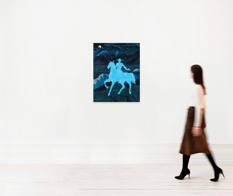 «На этой картине изображен мифологический персонаж моей личной вселенной — Лунный Ковбой. Этот герой, один из тех обитателей параллельного мира духов, которые охраняют и поддерживают наш — следят за состоянием природы, охраняют землю от разрушений и реализуют законы физики, ведь многие из них являются одушевленными представителями природных феноменов, вроде молний, дождя или радуги или покровительствуют каким-то состояниям ума иди образу жизни людей. Так лунный ковбой — дух, оберегающий путешественников».
