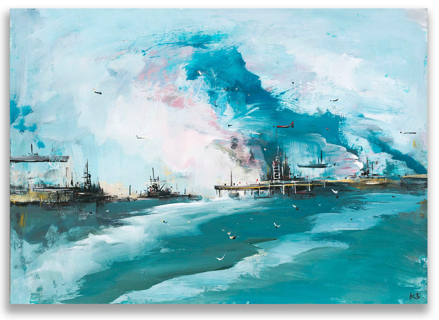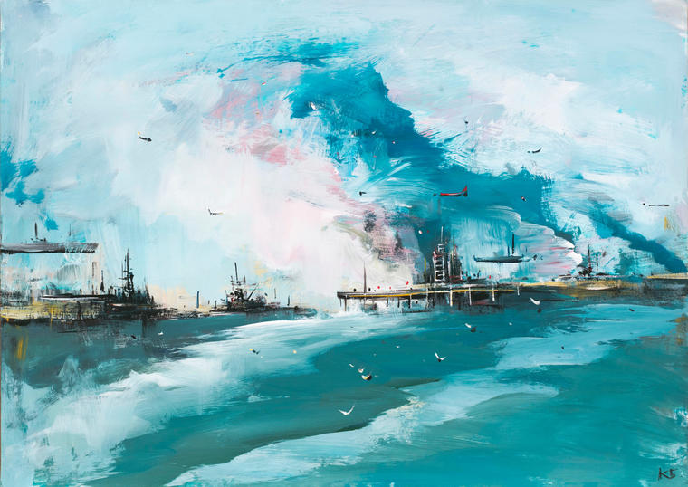 В представленной работе Константин Батынков не изменяет излюбленным темам, изображая гигантский корабль. Художник пишет работу в свойственной ему манере — размашистыми мазками с вкраплениями динамичных цветовых линий и точек, разделяя при этом композиционное пространство на две равные части воды и неба.