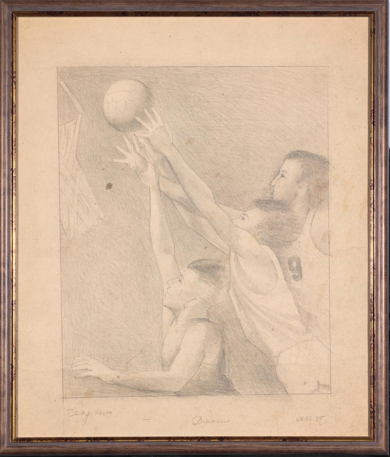 Манера художественного языка Егельского стремиться к усиленной графичности, он черпает тончайшую грацию линии у Боттичелли, воплотившего его художественный идеал. Строгость решения образа спорсменов, внимательная трактовка фактур, движения, заключенное внутри фигур создают впечатление яркой игры баскетболистов. Спорт и соревнование, истоки которых уходят в античность Древней Греции, установившей заветы пластического языка, манили неоакадемистов.