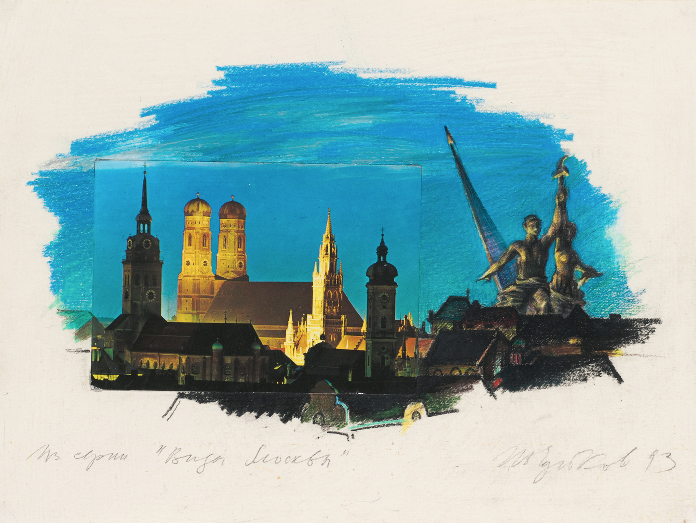 Работы из серии «Виды Москвы» отличает монтажная техника. Вид столицы с огромным монументом «Рабчоий и колхозница» сливается с открыткой какого-нибудь европейского города (здесь на переднем плане — Фрауэнкирхе, самая высокая церковь Мюнхена). Как отмечала Елена Петровская в обзорной статье о творчестве художника: «парадокс такого географически недостоверного ви́дения заключается, однако, в том, что новый гибридный город не воспринимается как нечто невозможное. Как раз наоборот. Именно потому, что используется язык туристических открыток, во многом опирающийся на эффект реальности, производимый всякой фотографией, — нагромождение достопримечательностей не поражает своей нереальностью».