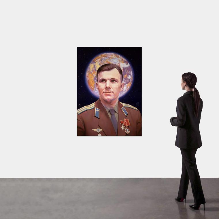 После 12 апреля 1961 года Гагарин стал популярнейшим человеком Земли, а правительства всех стран дружно и восторженно приглашали его посетить их с официальным визитом. Арт-группа Doping Pong в своей картине рассматривает феномен популярности Гагарина. В чем секрет магнетизма и всеобщей любви к этому человеку? Только лишь в том, что он первым отправился в космос? Или дело в его необычайно располагающей улыбке? Или тайна кроется в том, что Гагарин — собирательный, идеальный образ Нового Человека. Он — личность, не знающая границ, ксенофобии, страха, ненависти, злобы и алчности. Надчеловеческий образ.