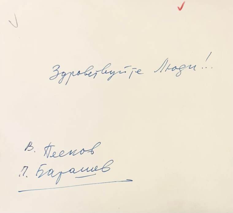 На обороте снимка стоят две фамилии — Павла Барашева, личного фотографа космонавта, и Василия Пескова — первого журналиста, рассказавшего миру о полете первого космонавта в Космос. Совместно с Геринасом они готовили репортаж о Юрии Гагарине.