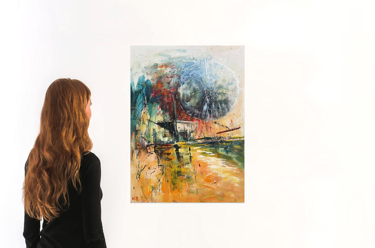 Константин Батынков пишет в свойственной ему манере — размашистыми мазками с вкраплениями динамичных черных линий и точек. На работе изображена сфера — излюбленный образ в творчестве автора. Исходя из названия и тематики, она может напоминать спутник или иное космическое тело. Интерес к небу сформировался у Батынкова еще в раннем детстве, когда он посещал кружки авиа- и судомоделирования. Особое влияние на него оказал отец, который был военно-морским летчиком. Несмотря на увлечения техническими науками, художник начал писать и рисовать с первого класса, после чего уже никогда не останавливался. Эта картина выдержана в сложной цветовой гамме, что отличает ее от более ранних работ автора, который до 2010-х годов создавал произведения используя черно-белый колорит.