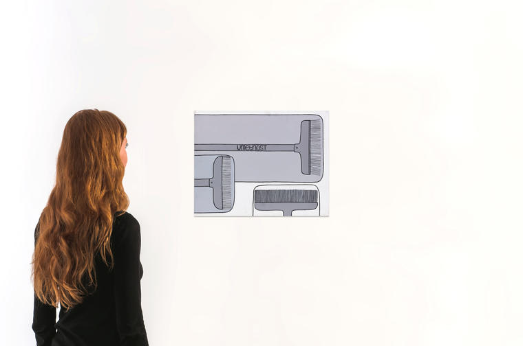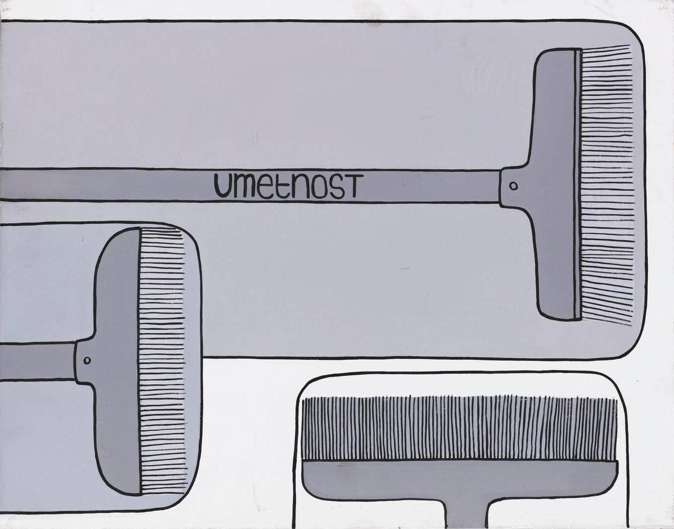 На словенском языке на ручке от малярной щетки написано «искусство». Фон представляет собой разбитое на монохромные плоскости, которые закрашиваются этими щетками. В работе сконцентрированы характерные для искусства Валерия Чтака особенности — лаконичность, строгость композиционных решений, монохромная цветовая гамма, соединение изображения и слова.