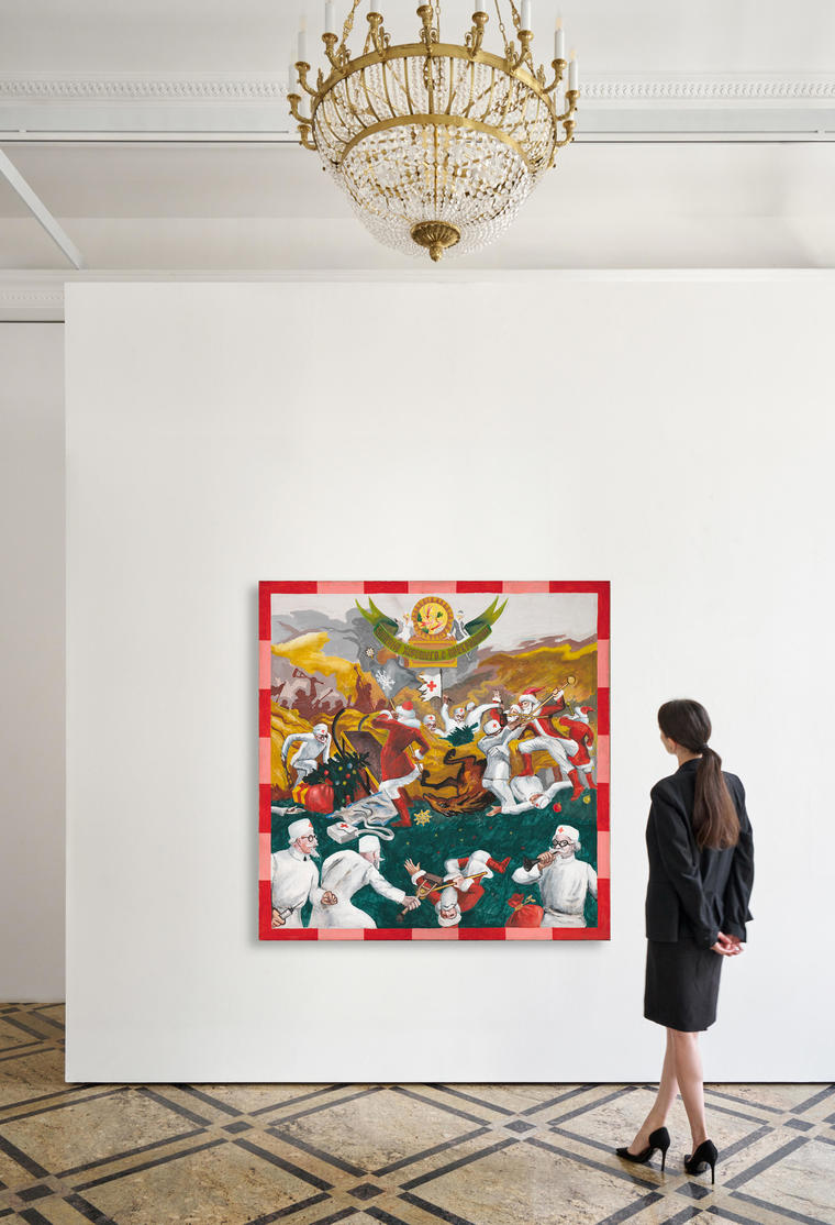 Звездочетов мастерски исследует низовую визуальную культуру: вызывает ассоциации с детскими книжками, агитплакатами и одновременно отсылает к травматичному опыту постсоветского сознания. Гербоподобная эмблема в верхней части композиции пародирует советскую символику. Звездочетов использует иконографию как средство художественной деконструкции, разрушая шаблоны и вызывая у зрителя когнитивный диссонанс.