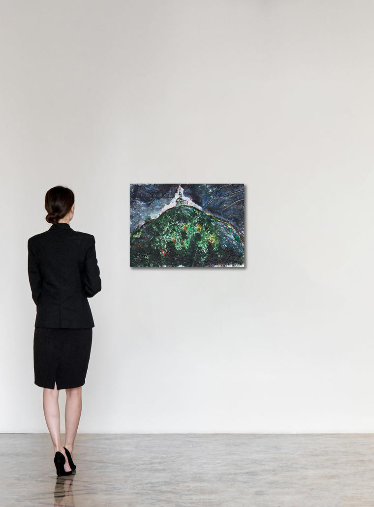 В представленной работе изображен один из излюбленных сюжетов Анатолия Зверева — пейзаж с церковью. Храмы, колокольни и церквушки неизменно появляются в его работах с самого начала творческого пути.