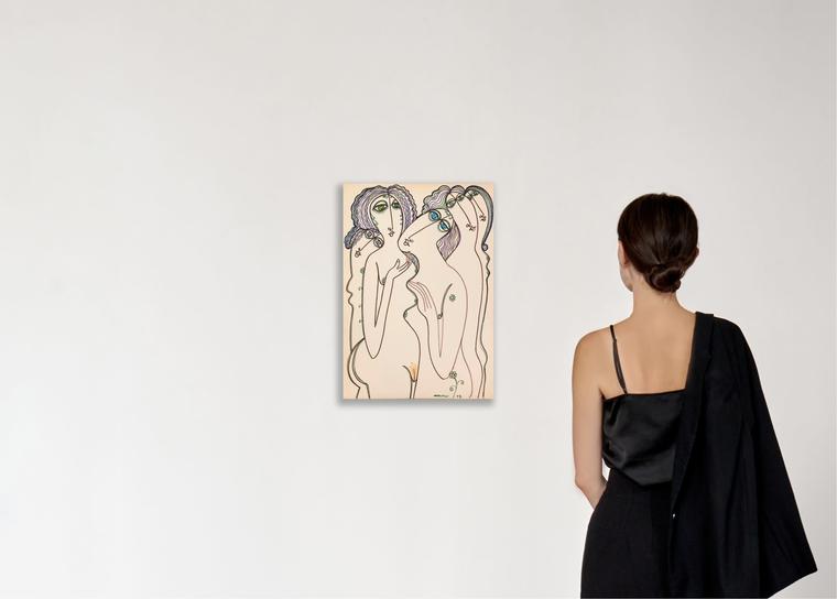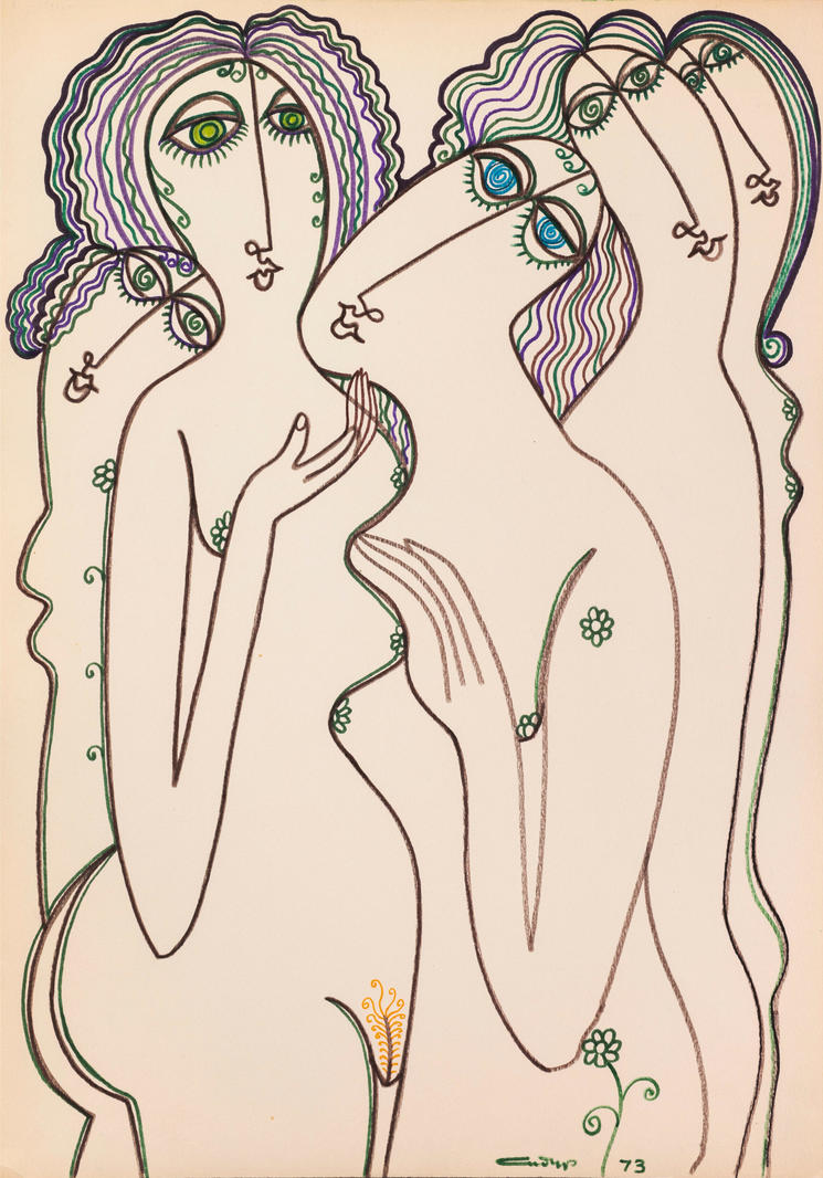Фигуры женщин, нарисованные текучими, непрерывными линиями, как бы вплетены в декоративный орнамент из стилизованных растений. Они не существуют отдельно от фона — напротив, фон становится частью их телесности, отражением их внутренней гармонии. Цветочные элементы здесь не просто украшение, а выражение той симбиотической связи человека и природы, которую Сидур настойчиво проповедует в своём графическом цикле.