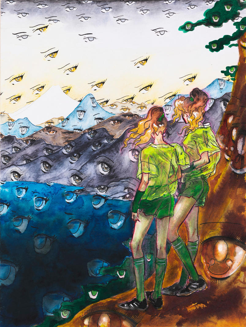 В основе композиции лежит лист Утагавы Хиросигэ, а также — неизбежно — отголосок «Странника над морем тумана» Фридриха. Однако здесь фигура путника раздваивается: лирическая героиня и её двойник вместе смотрят на пейзаж, переполненный глазами — то ли духов, то ли насекомых, то ли множественных отражений её собственного взгляда.