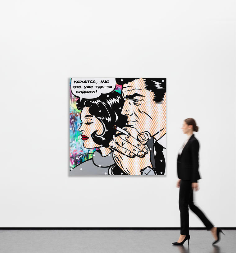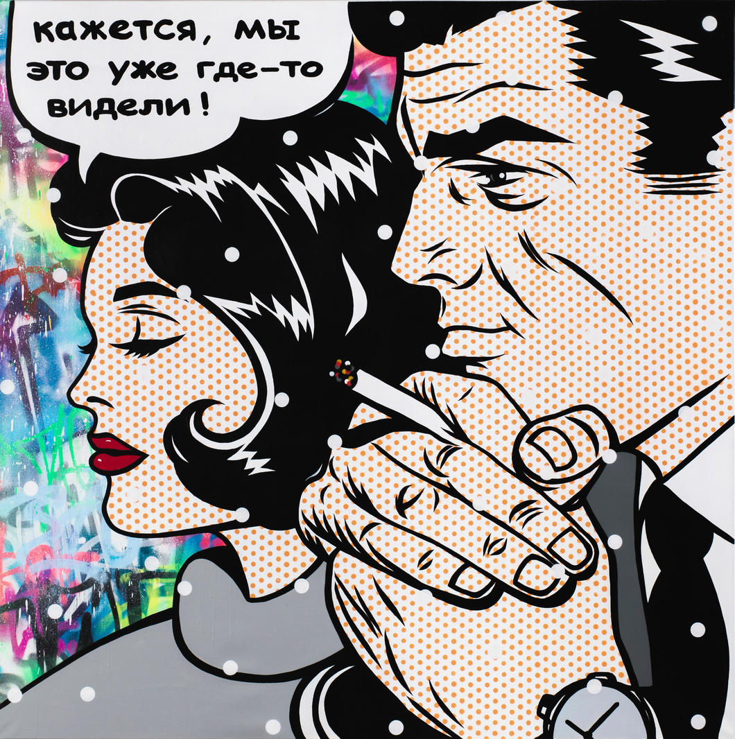 В работе «Кажется, мы это уже где-то видели» Степан Краснов объединяет живописную материальность акрила с графичностью спрея, создавая образ, балансирующий между уличной визуальностью и студийной живописью. Художник сознательно работает с ощущением дежавю: знакомые мотивы, будто вырванные из массовой визуальной памяти, оказываются перенесены на большой холст и обретают новую значимость. Контраст фактур, слоистость и открытая жесткость жеста формируют динамичное поле, где зритель сталкивается с опытом «узнавания» и одновременно — с его разрушением. Работа демонстрирует авторскую стратегию переосмысления привычных образов и коллективных визуальных кодов, переводя их в пространство личной интерпретации и современного художественного высказывания.
