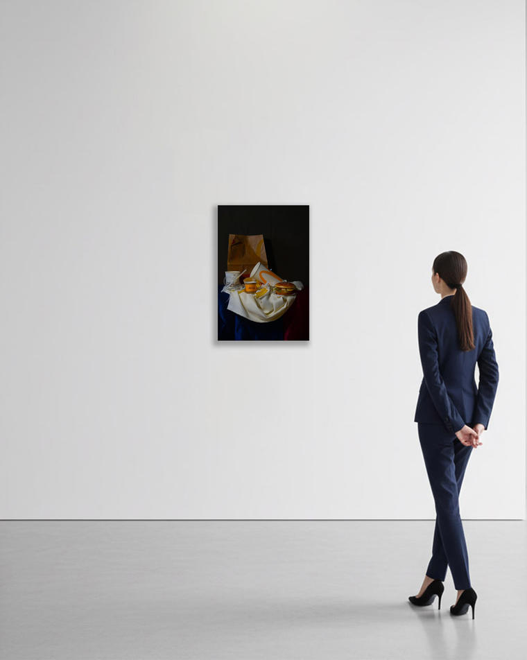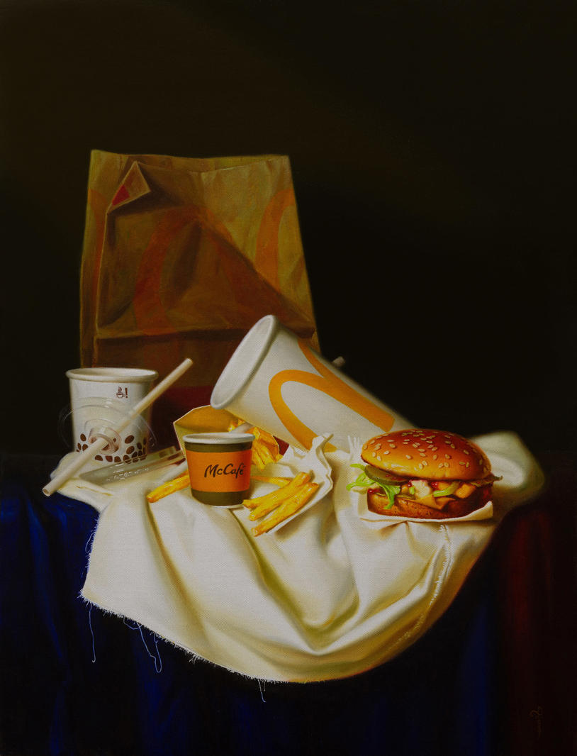 «Используя традиционную технику живописи голландских мастеров XVII века, я обращаюсь к вещам современной повседневной жизни. Героями моих картин становятся не хрустальные бокалы и серебряные блюда, а одноразовые упаковки фаст-фуда. Мы используем их считанные минуты и тут же выбрасываем. Они как нельзя лучше отражают идеи жанра vanitas, напоминая нам о быстротечности времени и хрупкости жизни. Одноразовый мир не может существовать долго — в этом вся его суть. Но его влияние на образ жизни человека невозможно недооценивать. Погоня за легкостью и комфортом, создание привычной среды потребления — все это формирует наше глубинное отношение к миру и теперь уже распространяется не только на вещи, но и на информацию и окружающих нас людей».