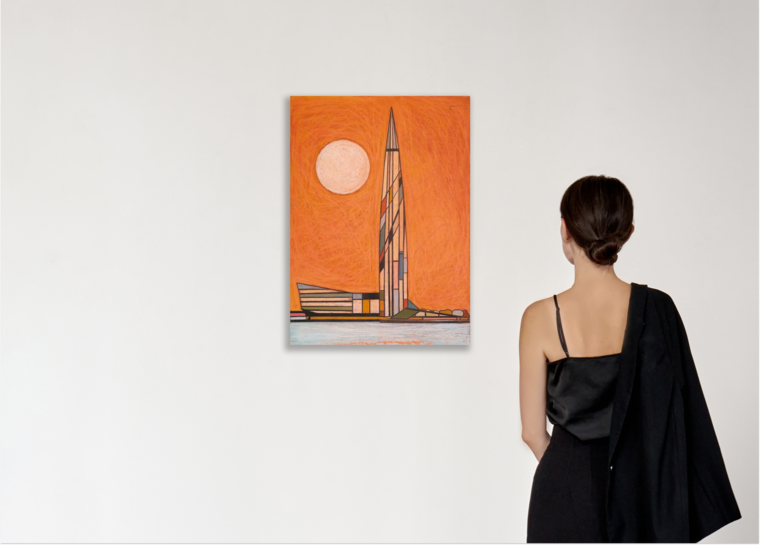 «Это конкретный пейзаж с изображением «Лахта центра» как новой архитектурной доминанты и одновременно символический образ современного города. Техника и колорит работы сознательно отсылают к традициям первой половины XX века, словно это романтический футуристичный вид с новаторскими для того времени сооружениями. Изображение как будто становится больше похоже на архитектурную фантазию из прошлого. Но именно это говорит о том, насколько модернистской является такая архитектура, ведь она сделана с ориентацией на идеи начала прошлого века. По цветовой гамме постройка будто вливается в пейзаж побережья. Оптически так и происходит, ведь архитектура здания почти зеркальная и отражает всю изменчивую атмосферу. Башня поэтизируется, становится своего рода модернистским символом с восходящим рядом с ним солнцем. В связи с этим сразу вспоминается сюжет с Эйфелевой башней, которую сначала воспринимали как чуждый, инородный элемент городской среды, а потом она стала одним из символов современного Парижа».