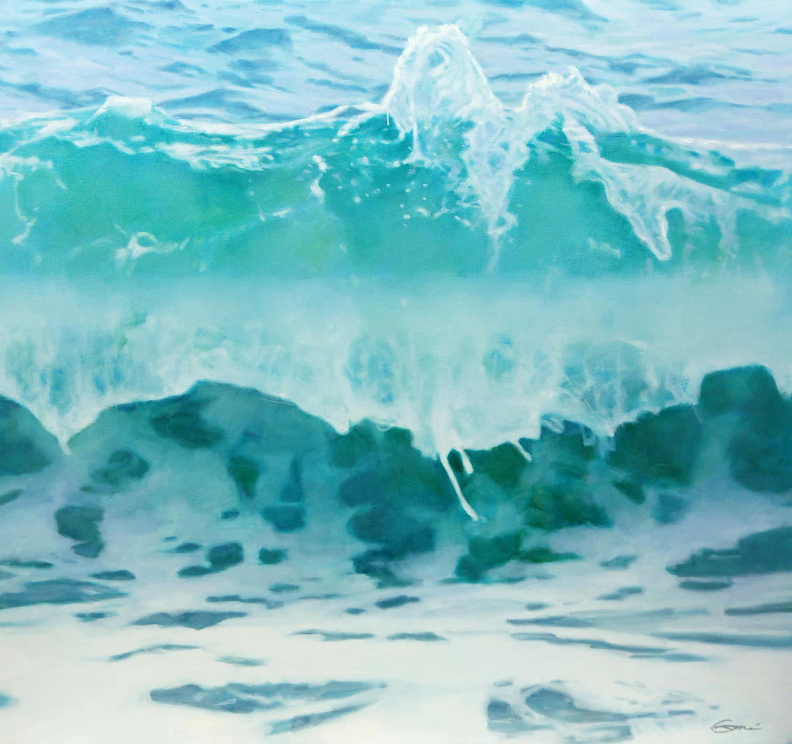 Эта работа продолжает серию картин из цикла «Дао воды». Если в предыдущих работах сюжетом была спокойная вода, вода с отражением облаков или текущий ручей, то сейчас я исследую изображения движущейся воды в её ежесекундно меняющемся состоянии, в бесконечном разнообразии форм.