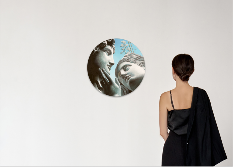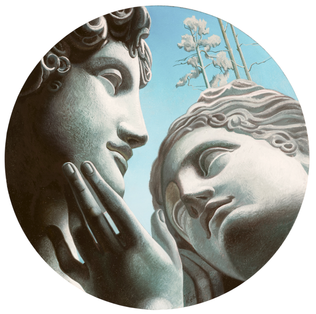 На полотнах античные фрагменты — головы скульптур, которые оказываются среди русского пейзажа. На первый взгляд эти образы кажутся чуждыми среде — слишком мраморные, классические. Но по мере рассматривания зритель замечает: природа принимает их. Момент культурной встречи превращается в медленное слияние — почти органичное. Так и возникает центральная мысль: любая культура, соприкасаясь с другой, не исчезает, а трансформируется. Она врастает в ландшафт — исторический, территориальный, человеческий — и становится его частью.