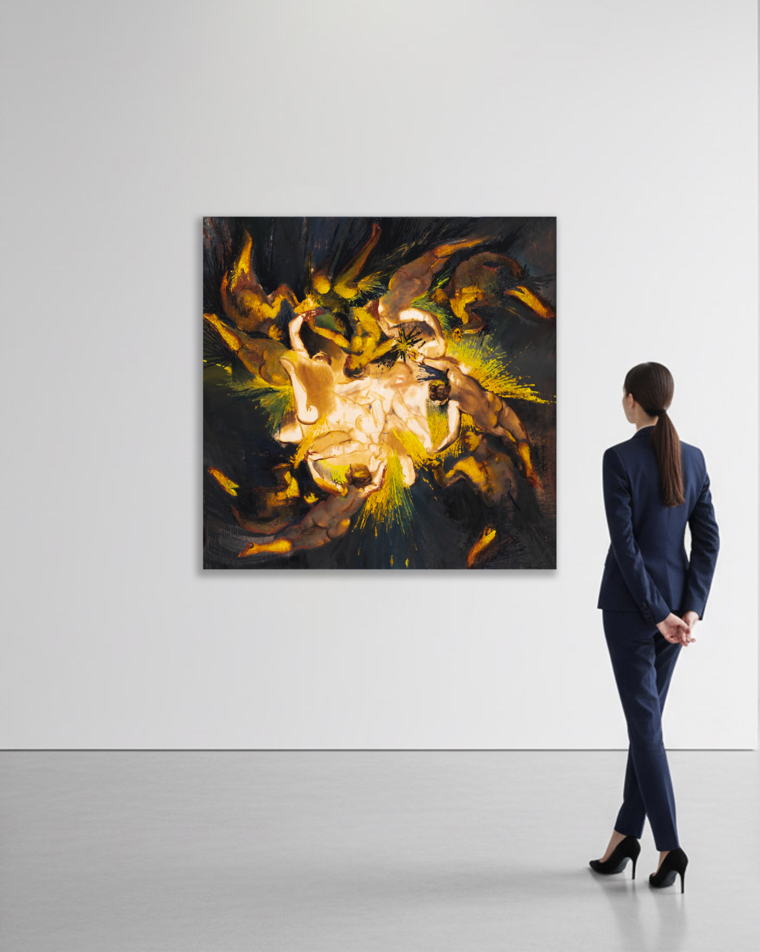 Отталкиваясь от живописных принципов Тинторетто — венецианского мастера позднего Возрождения, с его тяготением к космическим масштабам и закрученным композициям, — я перерабатываю эти мотивы в образ звезды, напоминающий калейдоскоп. Абстрактная форма собирается в фигуратив, а возникающее между ними световое напряжение формирует ощущение звёздного сияния.