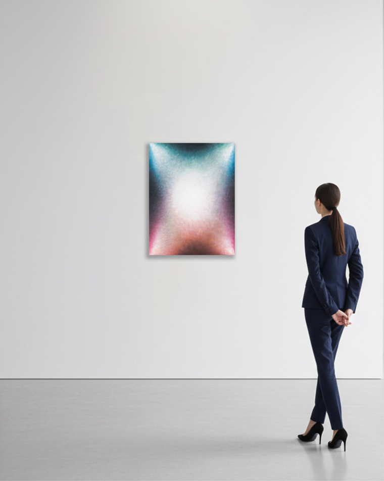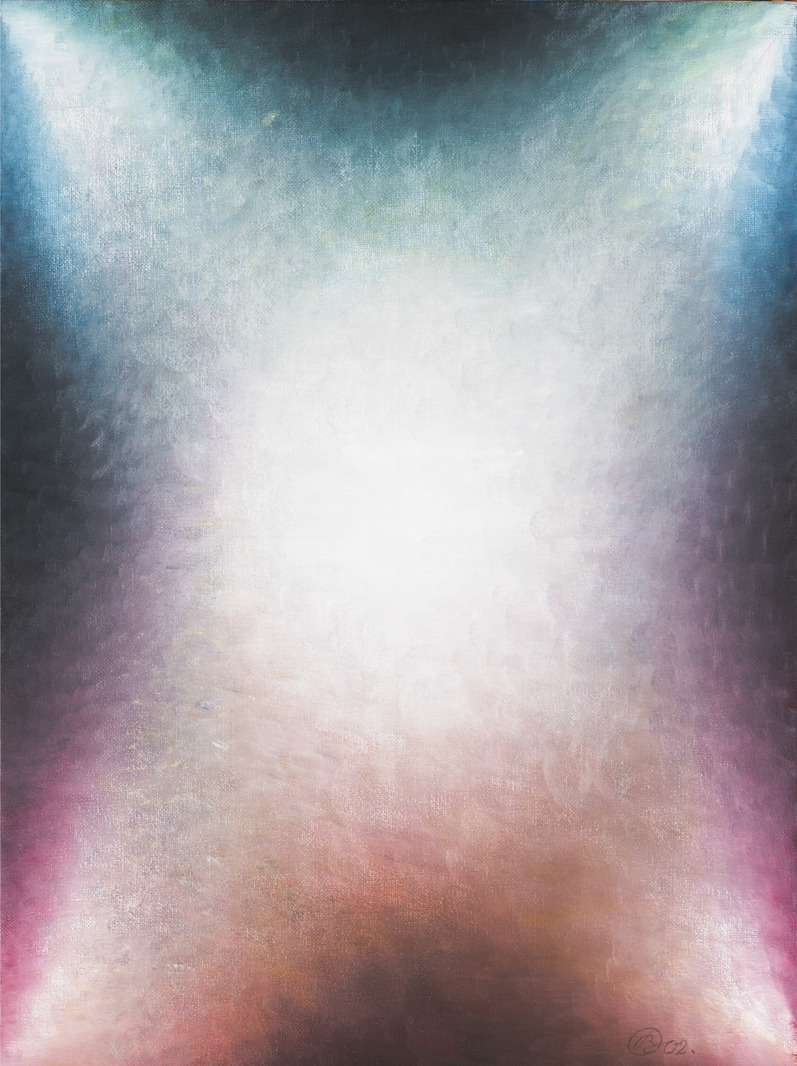 Представленная работа выделяется иным, более мягким колоритом: здесь световые лучи захватывают уже большее пространство, а переходы между оттенками становятся размытыми, сглаженными. Подобная тонкая живопись задает почти медитативную атмосферу, что отвечает и названию работы. «Высокое пространство» демонстрирует неожиданную пограничную сторону искусства, находящуюся между только-только появляющимся изображением или же, напротив, его полным исчезновением. Слово «высокое» здесь становится и пространственным термином, и маркером присутствия нечто внеземного. Таким образом, представленная работа может быть интерпретирована как эксперимент с оптическими эффектами, а также как фиксация духовного опыта, подобная современной иконе.