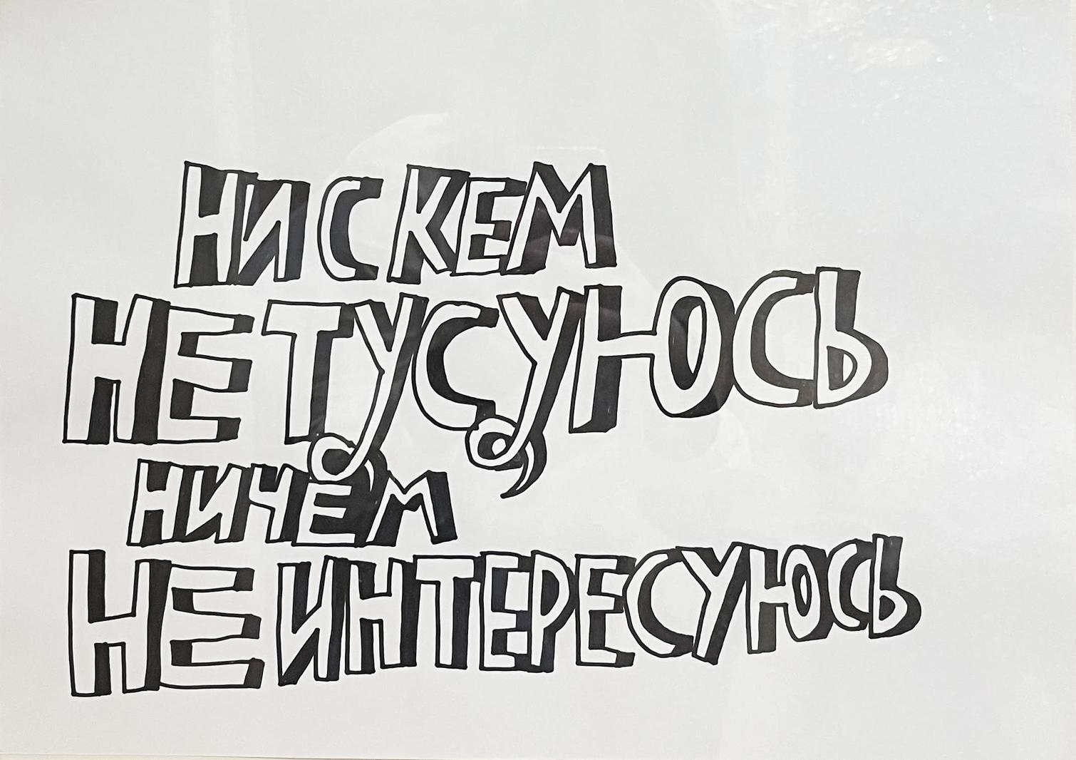 Представленная на торгах работа 2022 года выполнена в характерной для искусства Кирилла Кто стилистике. Для него характерна игра со словами и их звучанием: он часто использует экзистенциальные фразы, неожиданные вопросы и вызовы, обращаясь напрямую к зрителю. Художник иронизирует над своей фигурой, говоря о том, что это абсолютно нормально — иногда ничем не интересоваться и ни с кем не тусоваться.