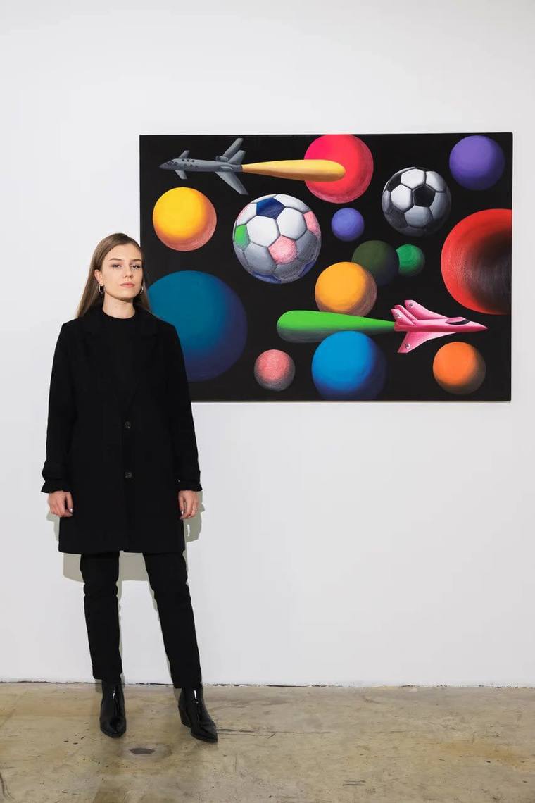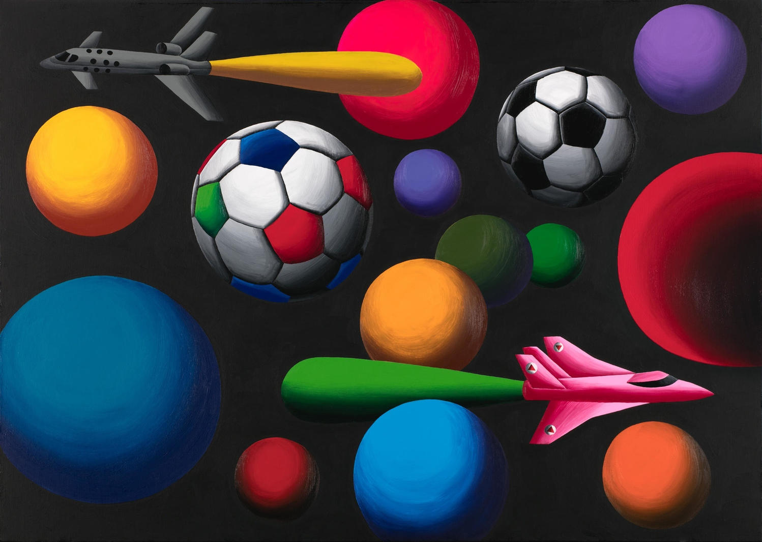Выражением этой преемственности стал пейзаж «Космический футбол», объединивший сразу две идеологически важные для страны темы: космос и спорт. Манера автора, работающего на границе декоративных возможностей живописи, проявилась здесь во всей своей самобытности. Гладкие яркие формы, взятые в равномерном холодном освещении как бы дрейфуют: еще немного, и небесные тела выстроятся в торжественный парад планет. Воспаряющие в пасе футбольные мячи и снующие туда-сюда самолеты придают композиции динамичность. А редкий для пейзажей Хвостова космический ландшафт в соединении с футбольной тематикой, воплощенной в лаконичных формах, порождает живописную игру планетарного масштаба. V