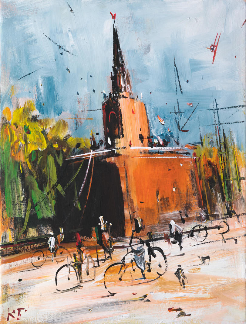 Картина относится к серии видов Кремля. Однако Батынков изображает не парадный вид: крепость не возвышается над Москвой, а вписана в городскую среду, таким образом, произведение очищено от политических коннотаций. Одним из любимых художников Константина Батынкова был Александр Лабас – отсюда его интерес к транспорту и стремительному городскому движению. В представленной работе Батынков несколькими штрихами изображает велосипедистов, наблюдающих за виражами аэроплана, и выстраивает композицию картины по диагонали, придавая динамику всем элементам. V