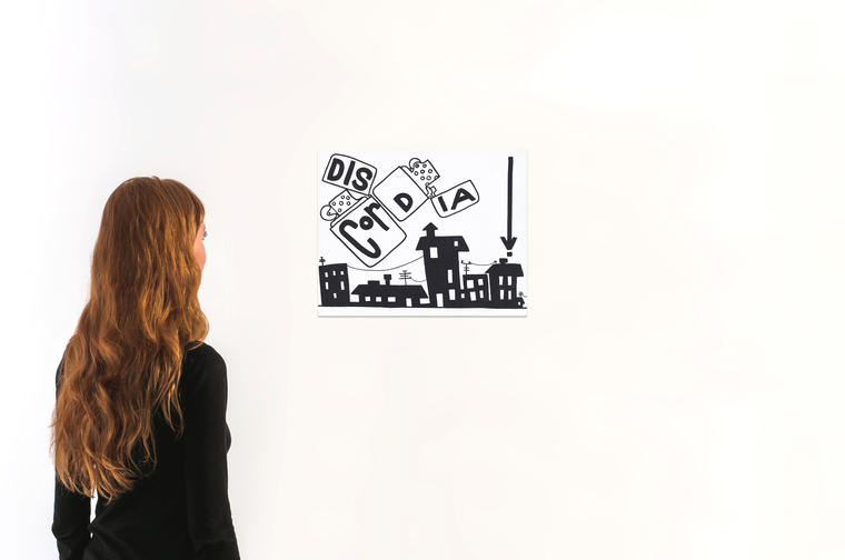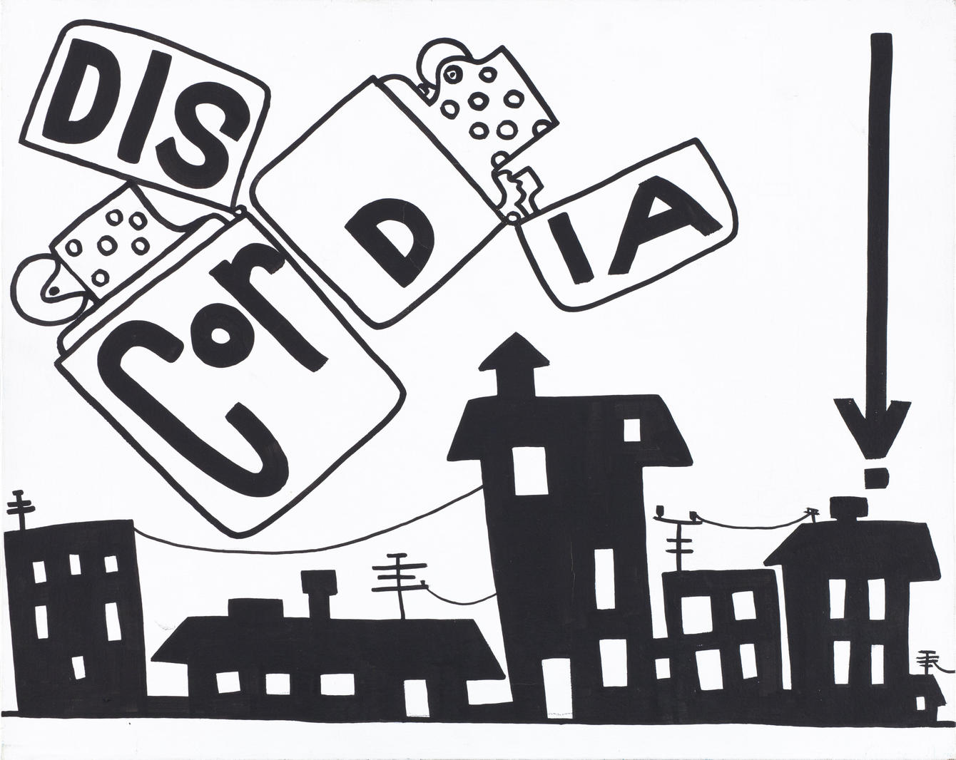 Работа выполнена в характерной чтаковской манере: изображение моделируется за счёт контуров и силуэтов, а доминирующую роль занимает текст. В скучный городской ландшафт из однотипных домов вносит динамику пара зажигалок, образующих разломанную на слоги надпись Discordiа. Чтак создаёт игру, соотнося текст и изображение, визуализируя смысл начертанного слова — раздор или разрушение.