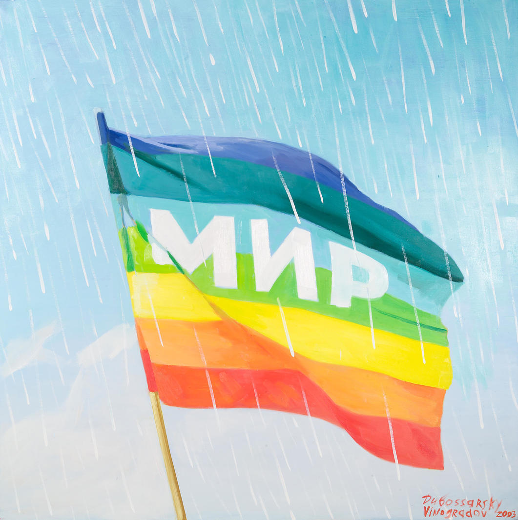 В основе представленной работы лежит визуальный язык социалистического реализма, сюжеты которого часто пестрят знаменами, флагами и транспарантами с ободряющими пропагандистскими лозунгами. Однако с новыми временами приходят новые атрибуты, и вместо первомайского алого знамени художники изображают радужный флаг международного пацифистского движения все с тем же призывом: «МИР».