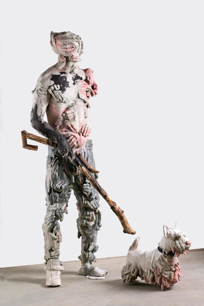Скульптура «Охотник с собакой» объединяет в себе активный пластический метод работы Петра Дьякова и его представления о будущем. Тактильный способ получения формы для скульптуры, хранящий в прямом смысле бесчисленное количество отпечатков автора, последовательно разрабатываемый Дьяковым, здесь обращен в ироничную историю о постапокалипическом герое-охотнике, мутировавшем под действием радикальных изменений внешней среды.