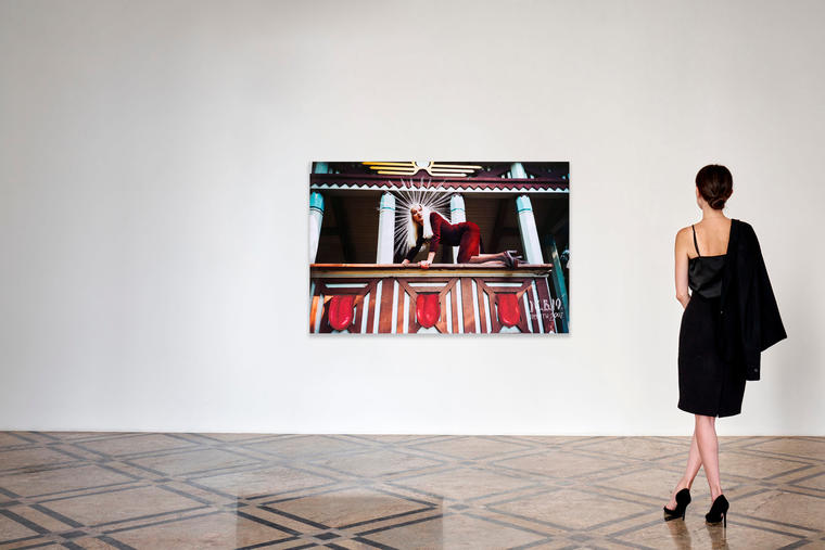 В представленной работе используется узнаваемая авторская техника — «раскраска» и «расцарапка». Страстно-красным цветом подчеркнуто платье и подошвы туфель, а на парапете дорисованы три языка, которые то ли призваны подогревать и без того «горячую» сценку, то ли должны напоминать комично раскрытые рты во время пения. В целом благодаря этим акцентам выстраивается довольно четкая колористическая композиция. В центре от головы Родович исходит «сияние», как и положено настоящей звезде. «Нимб», так же, как колготки, — в крупную сетку и подпись в углу: «М.В.Ю. Пенаты. 2007» художник, в своей манере, процарапывает прямо по поверхности фотографии.