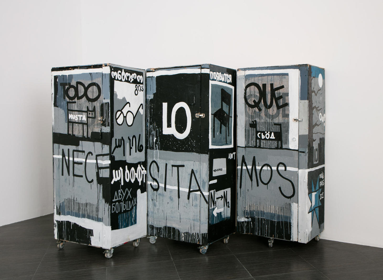 Ребус Чтака из трёх шкафов складывается в поэтические и риторические рассуждения. На фронтальной части — на испанском: «Всё, что нам нужно». Надпись будто обещает, что мы найдём это внутри шкафов. Но всё снаружи, и это тонкие ниточки вопросов-ответов на самых разных языках.