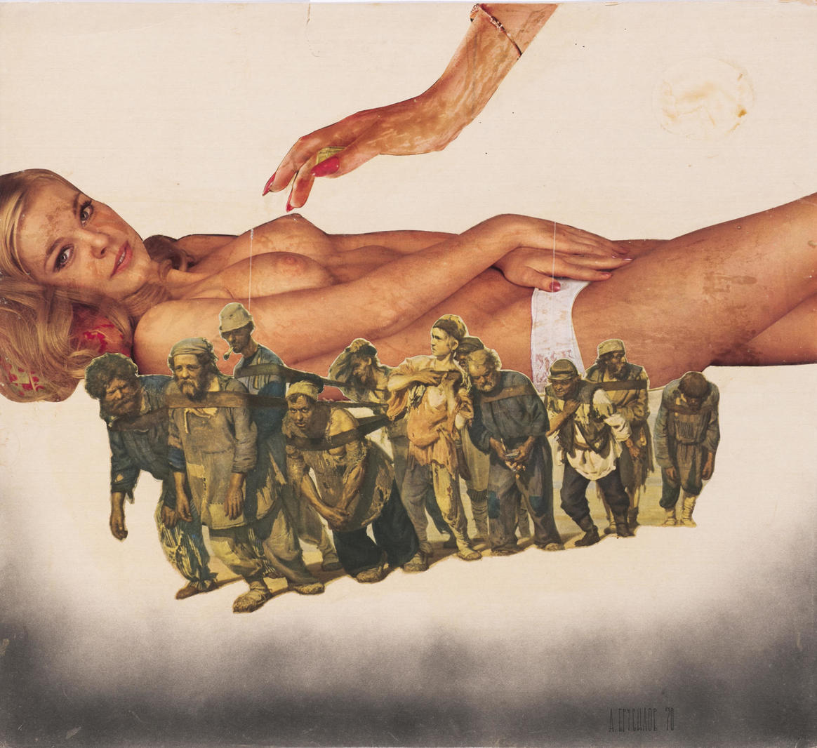 Удивительная энергия и интерес к жизни во всех ее проявлениях выделяли Брусиловского среди художников андеграунда. Даже мрачные годы застоя он, смеясь, называл «чудными», потому что именно в этот период его мастерская на Новокузнецкой стала одним из центров московской богемной жизни. Нужно понимать, что в 1970-е годы сексуальность для советского человека все еще была некой абстракцией: вопросы полового воспитания едва начинали появляться на повестке дня (в 1969 году, например, выходит в свет «Новая книга о супружестве» Рудольфа Нойберта), но любое изображение половых органов по-прежнему считалось порнографией. Голые девицы в произведениях Брусиловского — это всегда некое эротическое переживание, вытесненное из сознания советского субъекта. Для усиления абсурда художник помещает модель на бурлаков из знаменитой картины Ильи Репина, используя их как ироничную метафору советского народа.