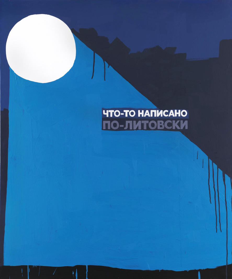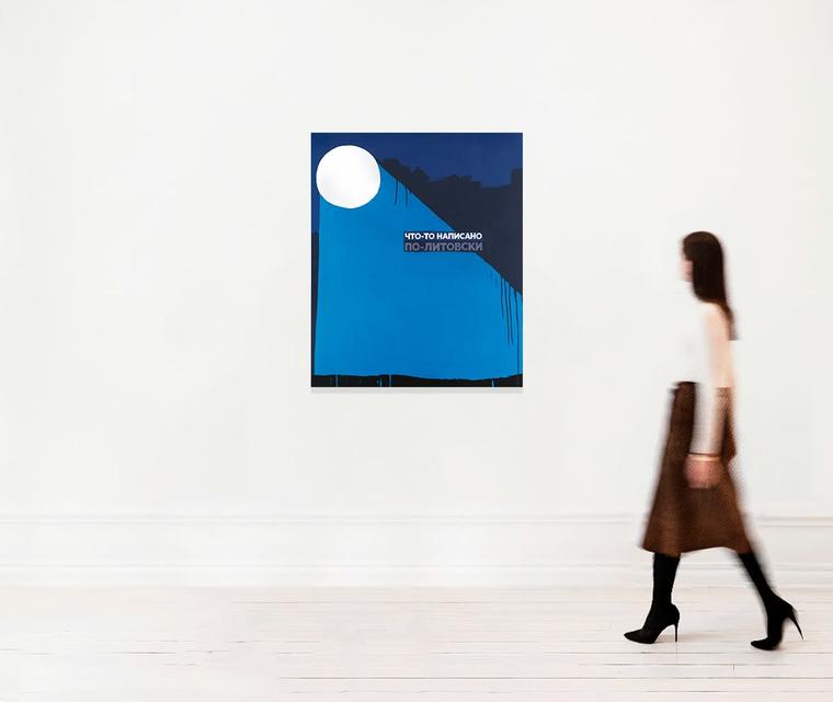 Представленная на торгах работа создана Валерием Чтаком в 2018 году. Свет от лунного диска заполняет большую часть композиции, образуя непроницаемую синюю плоскость, за которой скрываются очертания ночного города. Ироничная надпись «что-то написано по-литовски», создающая неповторимую игру смыслов, и минималистичное цветовое решение с характерными потеками краски — фирменные черты искусства Чтака.