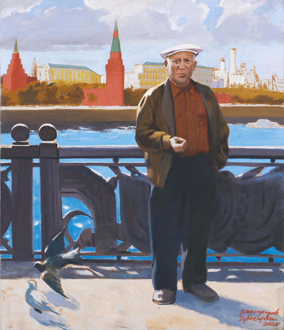 Работа “Пикассо в Москве” — это авторская реплика первой совместной картины Виноградова и Дубосарского, написанной в 1994 году. Работа дала название одноименной выставке, посвященной знаменитой экспозиции Пикассо в Москве (1956). Одним из экспонатов выставки и стал холст с масштабным портретом Пикассо в стиле соцреализма: знаменитый художник изображен на набережной рядом с Большим каменным мостом, позади виднеется Кремль. Пикассо, икона западной художественной сцены, одет скромно: простая рубашка, пиджак, ботинки. И лишь белый берет, перекликающийся с цветом церковных стен, помогает вспомнить о судьбе творца. Работа, подаренная Бакштейну, немного изменена: по-другому выписан архитектурный ансамбль, река. Ее сопровождает дарственная подпись: “Несгибаемому Иосифу в День славного юбилея от Саши и Вовы”.