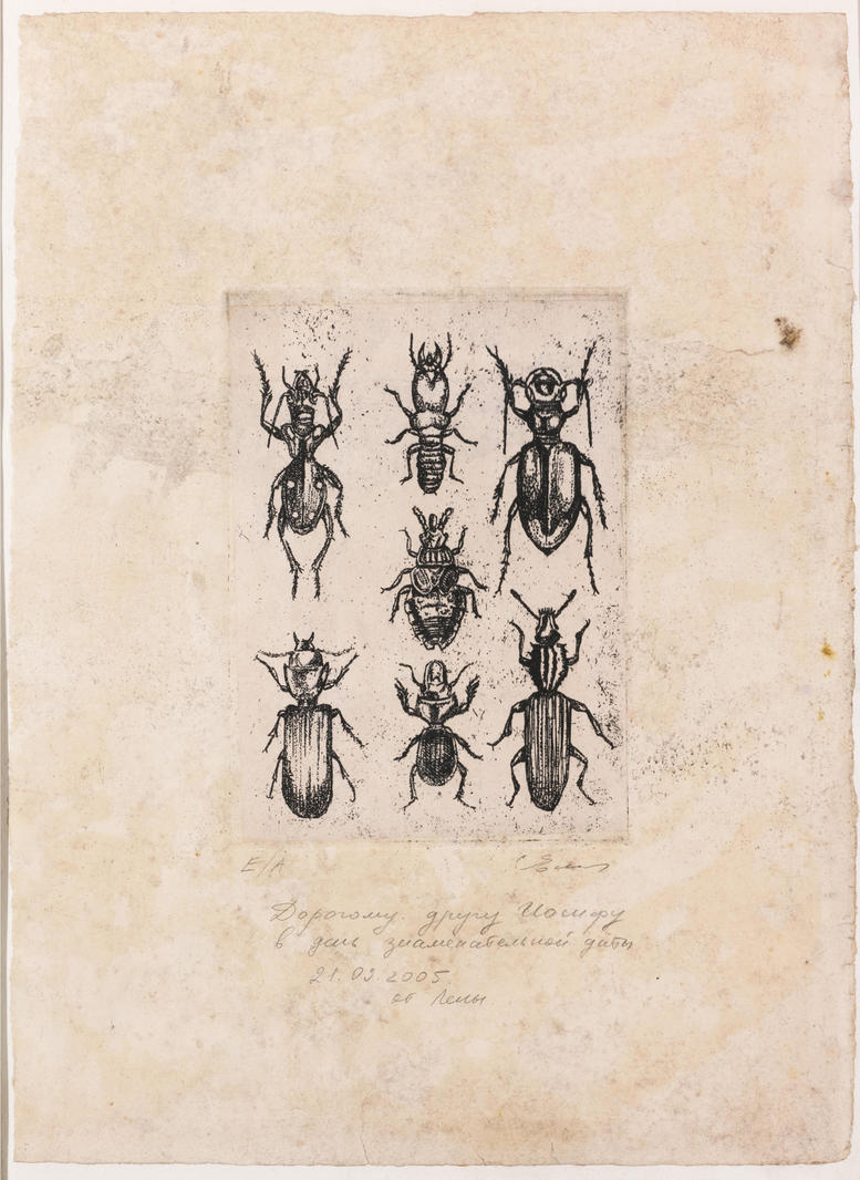 Работа Елены Елагиной, подаренная Бакштейну, не принадлежит к какой-либо серии, но концептуально продолжает идею выставки "Вредители" (XL-галерея, 2002), над созданием которой художница в творческом дуэте с Игорем Макаревичем работала практически 10 лет. В этой работе Елагина продолжает исследовать некий "миф о насекомых", который сумел занять прочные позиции в системе кодов современного человека. Но, в отличие от вышеупомянутой выставки, на которой насекомые представали в виде железных и угрожающих конструкций, здесь эти жуки представлены в виде небольшого "куска" коллекции, изображенного на бумаге. Нагромождение смыслов позволяет создать многослойную интерпретацию художественного замысла работы: здесь могут быть применены не только классические трактовки энтомологических мотивов в искусстве, но и самоцитация, а также намек на деятельность Бакштейна-коллекционера.